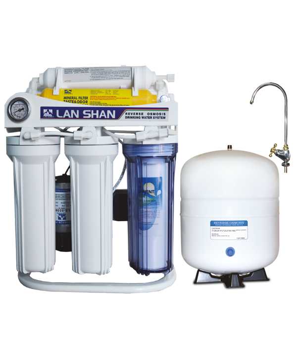 Lanshan LSRO-575G mineral RO water purifier is the six stages which provides 75 GPD or 250 liters pure waer per day. It can reserve 15 liters water in NFS pressured tank which will be set at any hidden place in kitchen or cabinet. 100% Taiwan original brand.